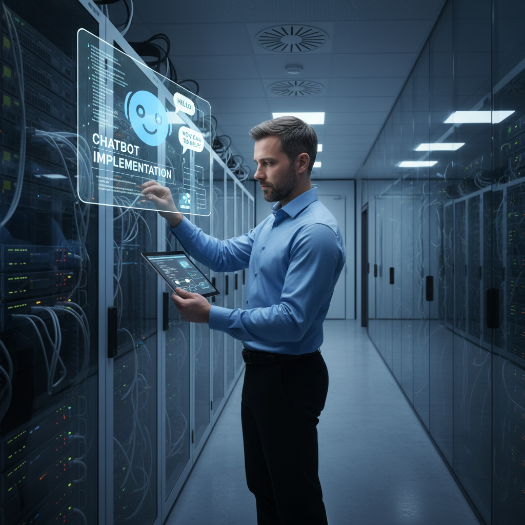 Specjalista IT wdrażający chatbota na stronie internetowej, centrum danych, bezpieczeństwo AI
