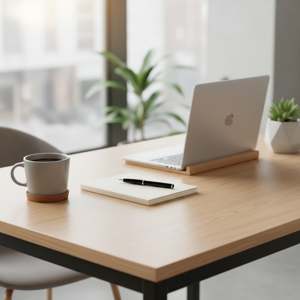 Obraz ilustrujący zdrowy rytuał porannego rozpoczęcia pracy bez natychmiastowego sprawdzania maili.